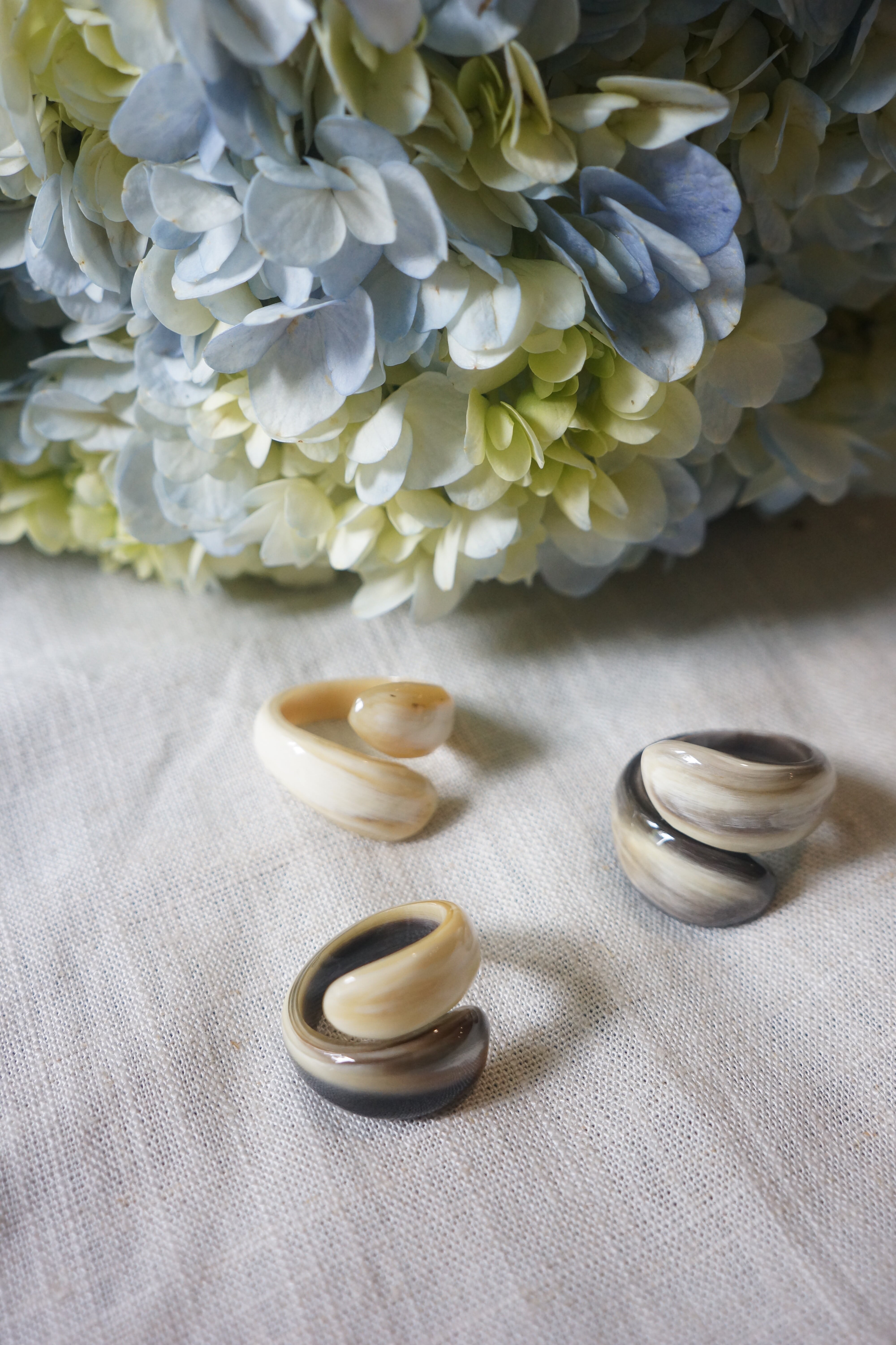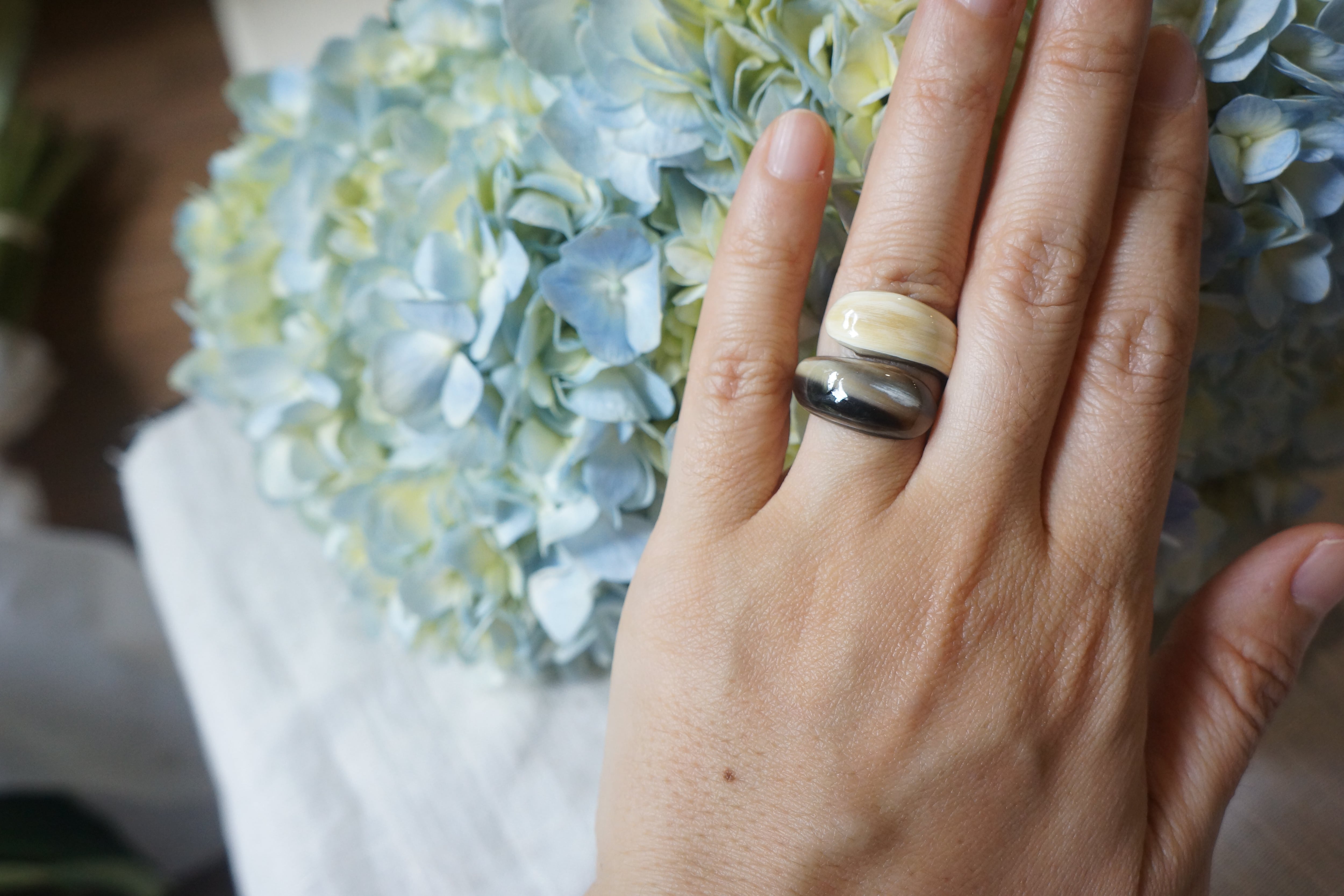 天然素材ならではの、一点ごとに異なる模様が魅力の水牛角リング。